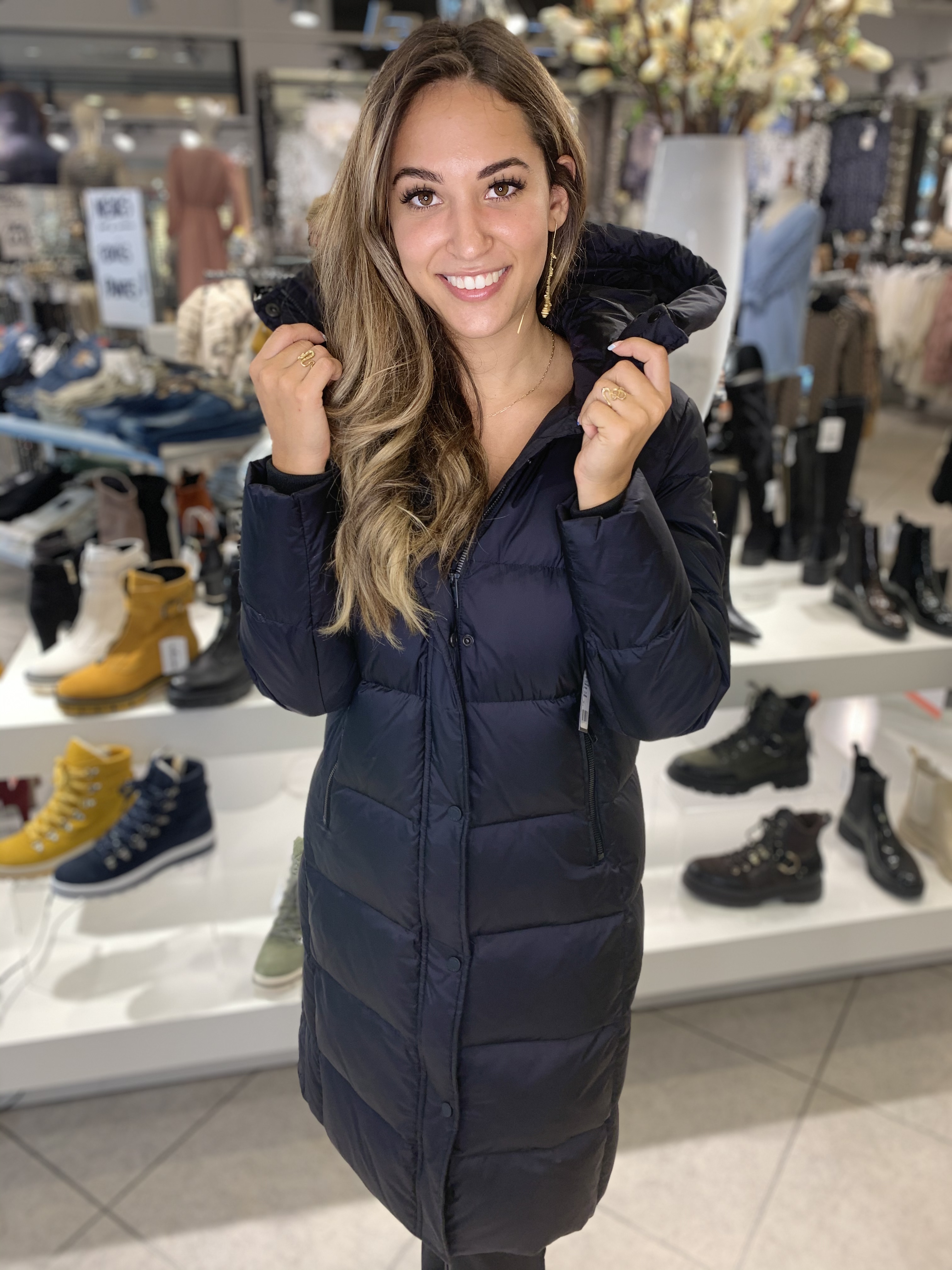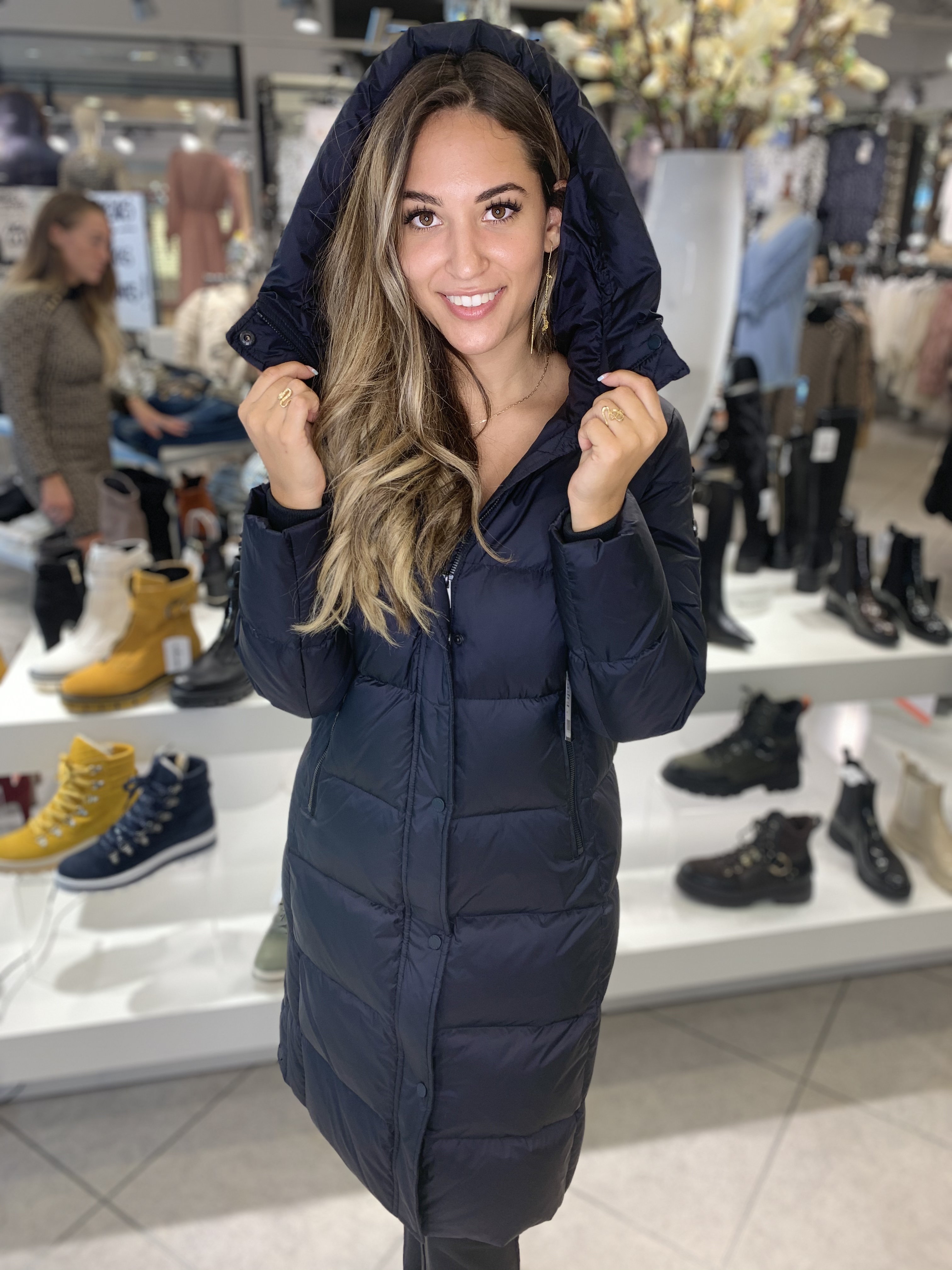 Flot lang dun jakke, med hætte, gennem gående dobbelt lynlås, stiklommer med lynlås, indvendig rib ved ærmeafslutning, 2 inderlommer.
