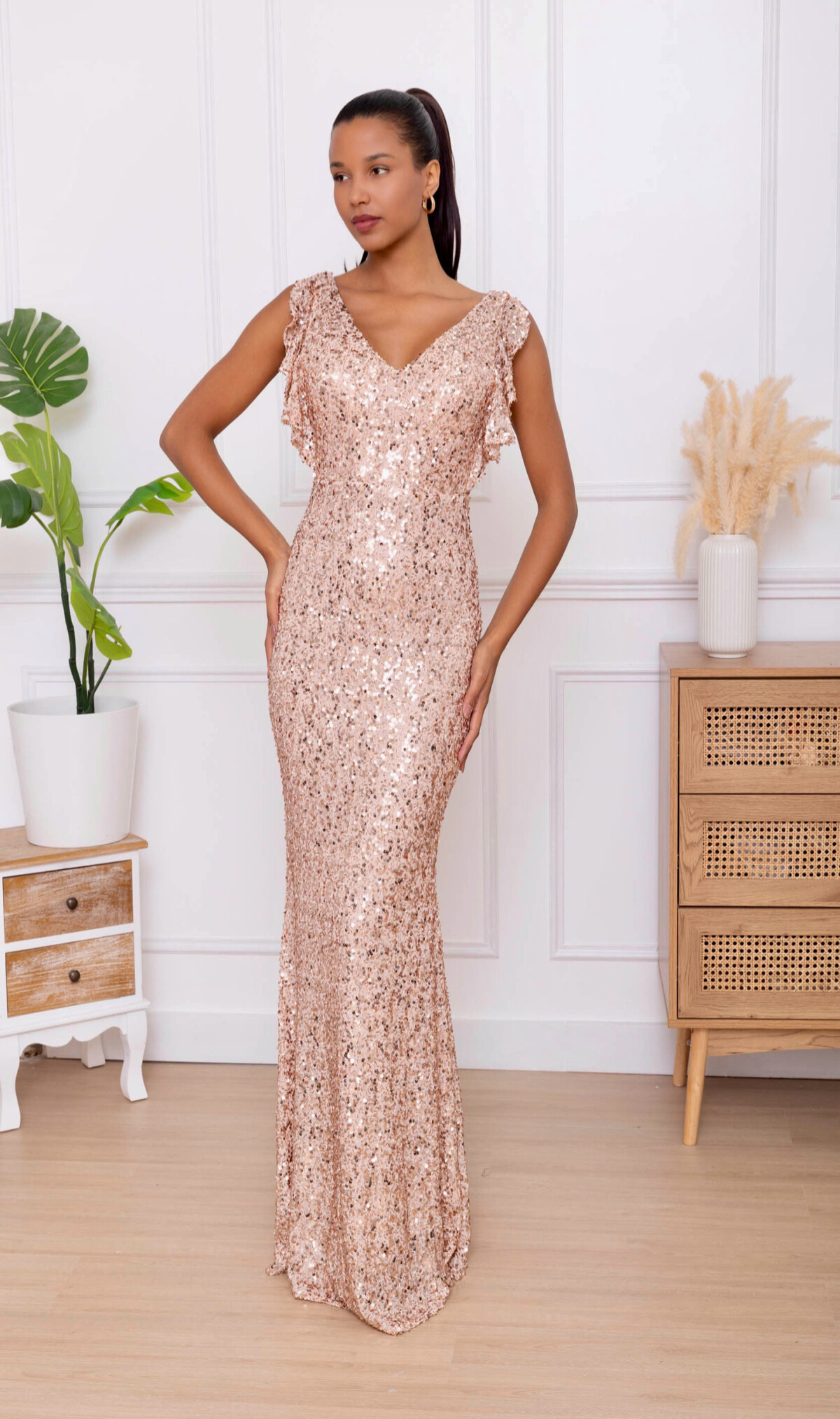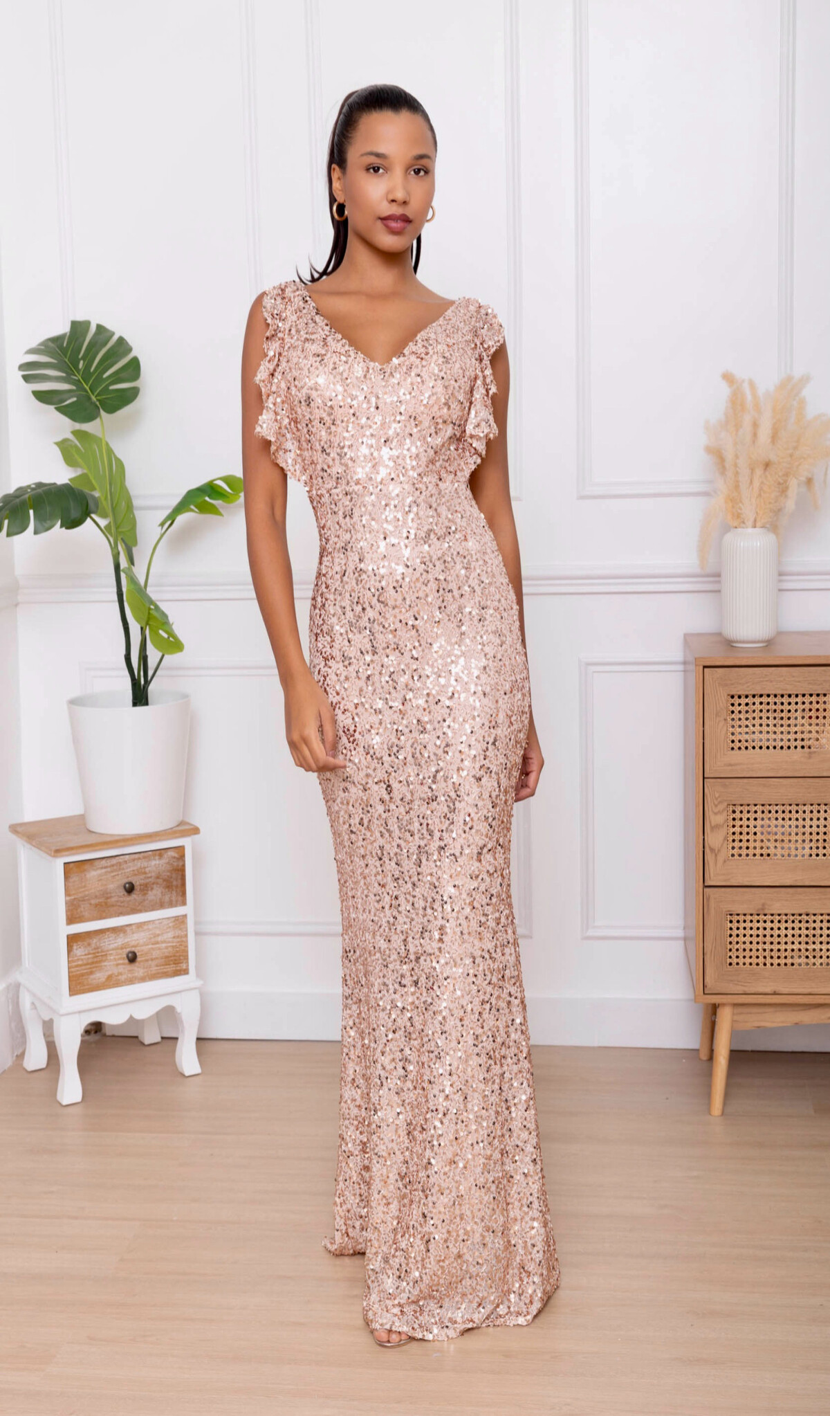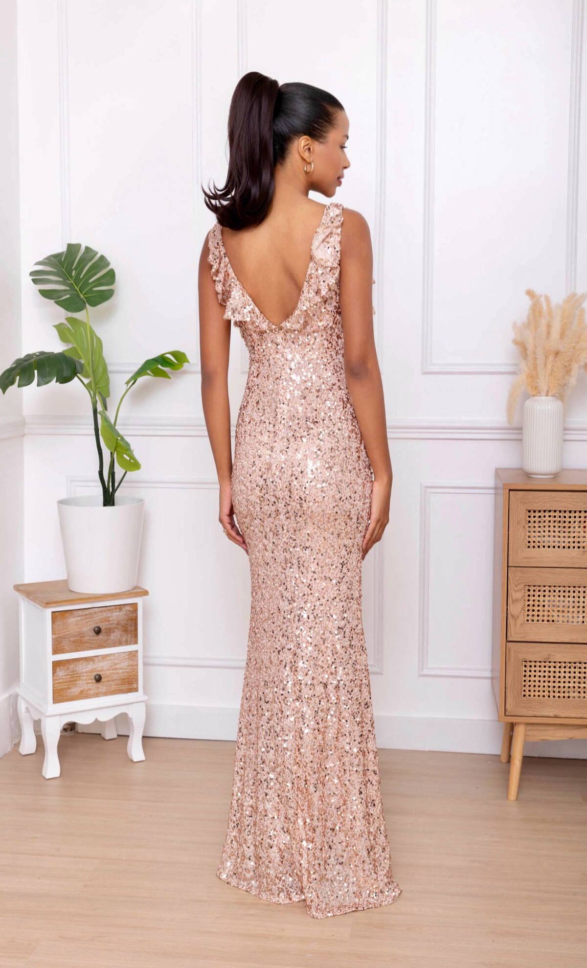 Smuk lang paliet kjole med bar ryg og fint frynseærme. Figursyet og perfekt til den næste fest.